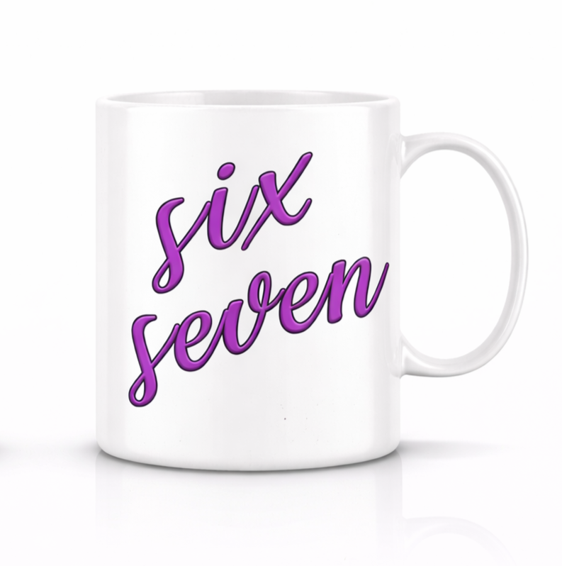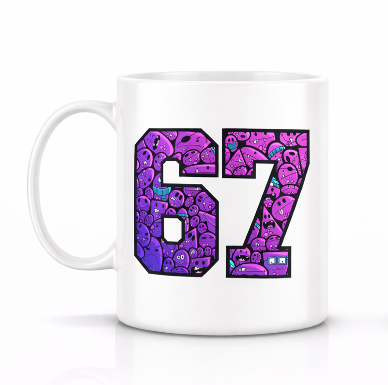 Kubek z dużą liczbą 67 i napisem „six seven” to wzór inspirowany aktualnym trendem internetowym i estetyką meme. Minimalistyczna forma, wyrazista grafika i lekko tajemniczy przekaz sprawiają, że kubek przyciąga wzrok i wywołuje pytania.