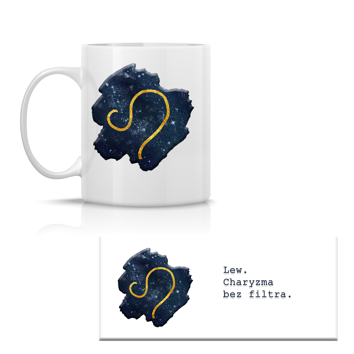 Ten kubek został zaprojektowany dokładnie w tym duchu. Głębokie, kosmiczne tło symbolizuje siłę i wewnętrzny ogień, a złoty znak Lwa podkreśla dominującą naturę i magnetyzm tego znaku. Minimalistyczna forma sprawia, że grafika przyciąga uwagę, ale nie potrzebuje zbędnych dodatków — tak jak Lew nie potrzebuje potwierdzenia swojej wartości.