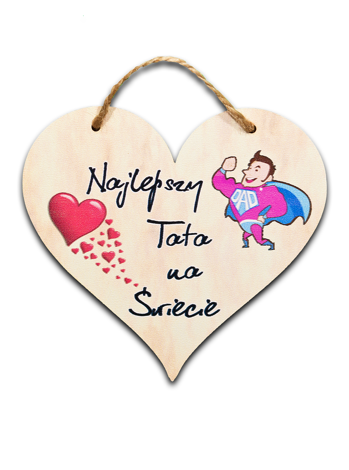 Produkt wykonany z płyty MDF, z estetycznym nadrukiem oraz jutowym sznurkiem do zawieszenia. Doskonale sprawdzi się jako dekoracja domu, dodatek do prezentu lub symboliczny upominek od serca.