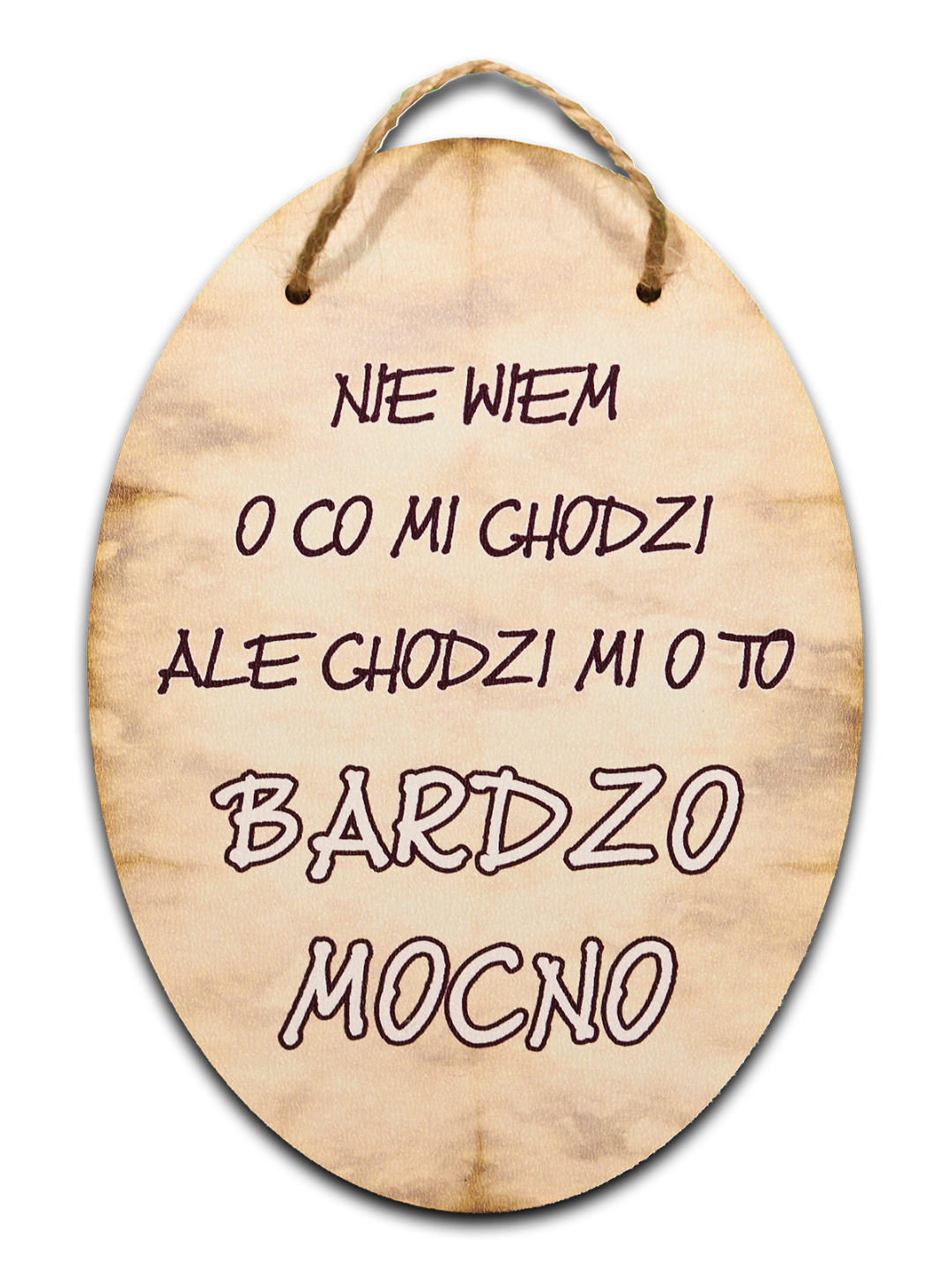 Wykonana z płyty MDF o grubości ok. 5 mm, wyposażona w jutowy sznurek do zawieszenia.